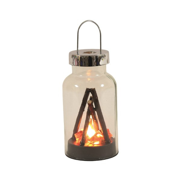 Realistic flickering flame effect campfire encased in a sleek, modern lantern with a chrome top and handle to create a warm, cosy atmosphere. Perfect for mood lighting, ambient décor or as a safe alternative to traditional candles, this LED lantern adds a soft glow to any setting.